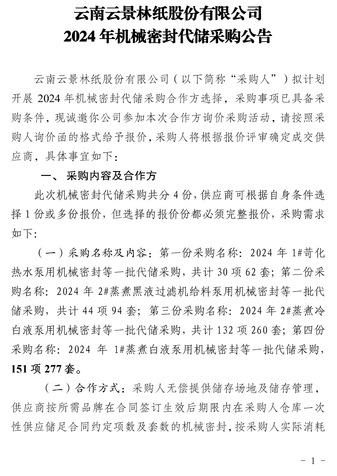 云南云景林紙股份有限公司2024年機(jī)械密封代儲采購公告