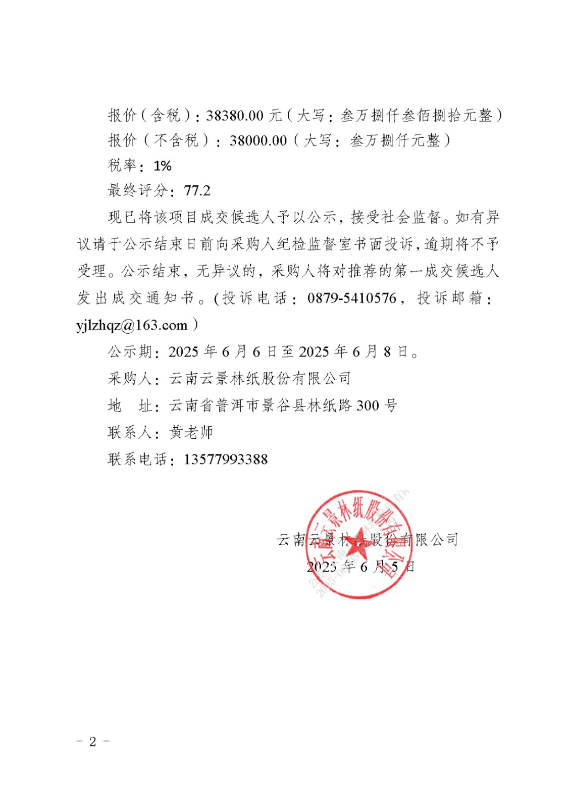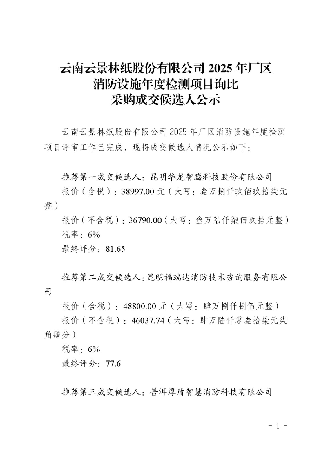 云南云景林紙股份有限公司2025年廠區(qū)消防設(shè)施年度檢測(cè)項(xiàng)目詢比采購(gòu)成交候選人公示