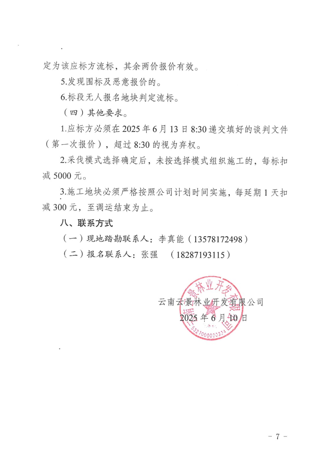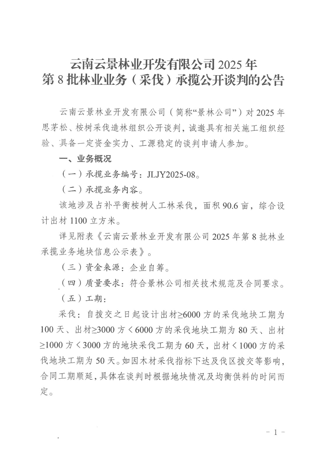 云南云景林業(yè)開發(fā)有限公司2025年第8批林業(yè)業(yè)務(wù)(采伐)承攬公開談判的公告