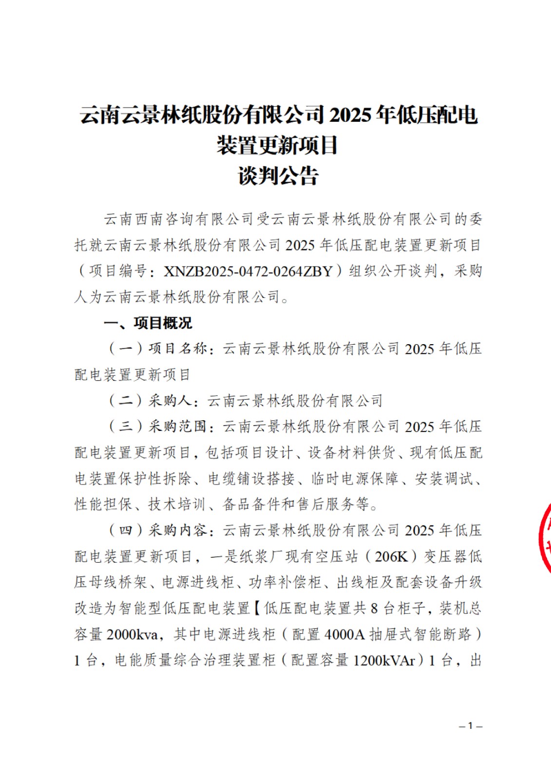 云南云景林紙股份有限公司2025年低壓配電裝置更新項(xiàng)目談判公告