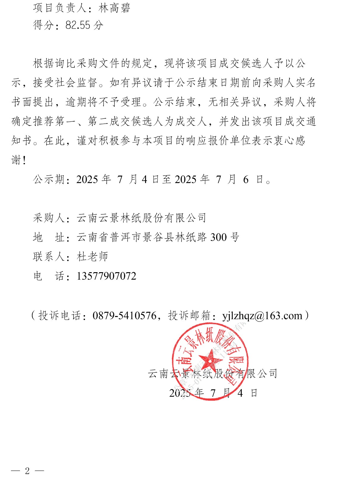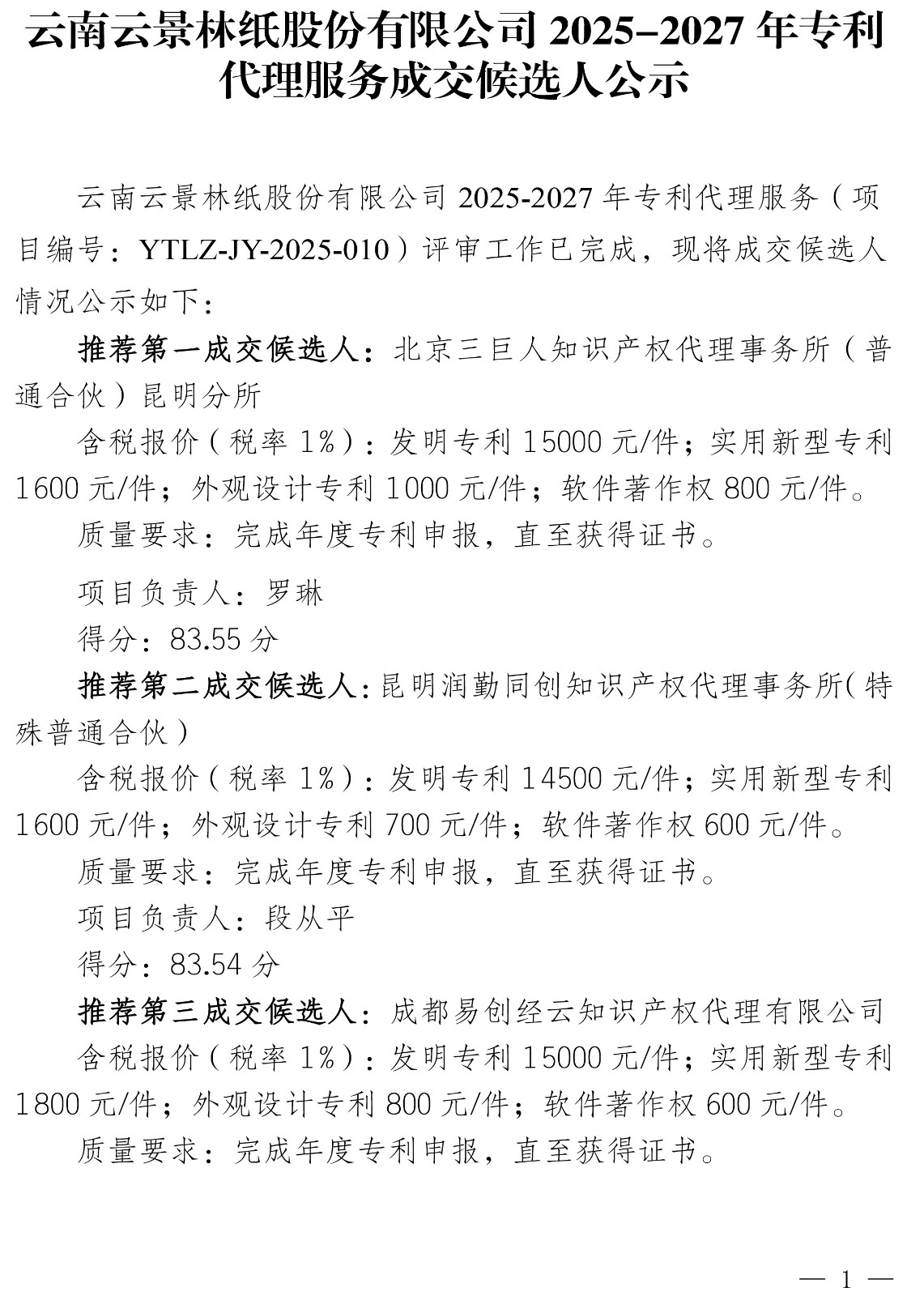 云南云景林紙股份有限公司2025-2027年專利代理服務成交候選人公示