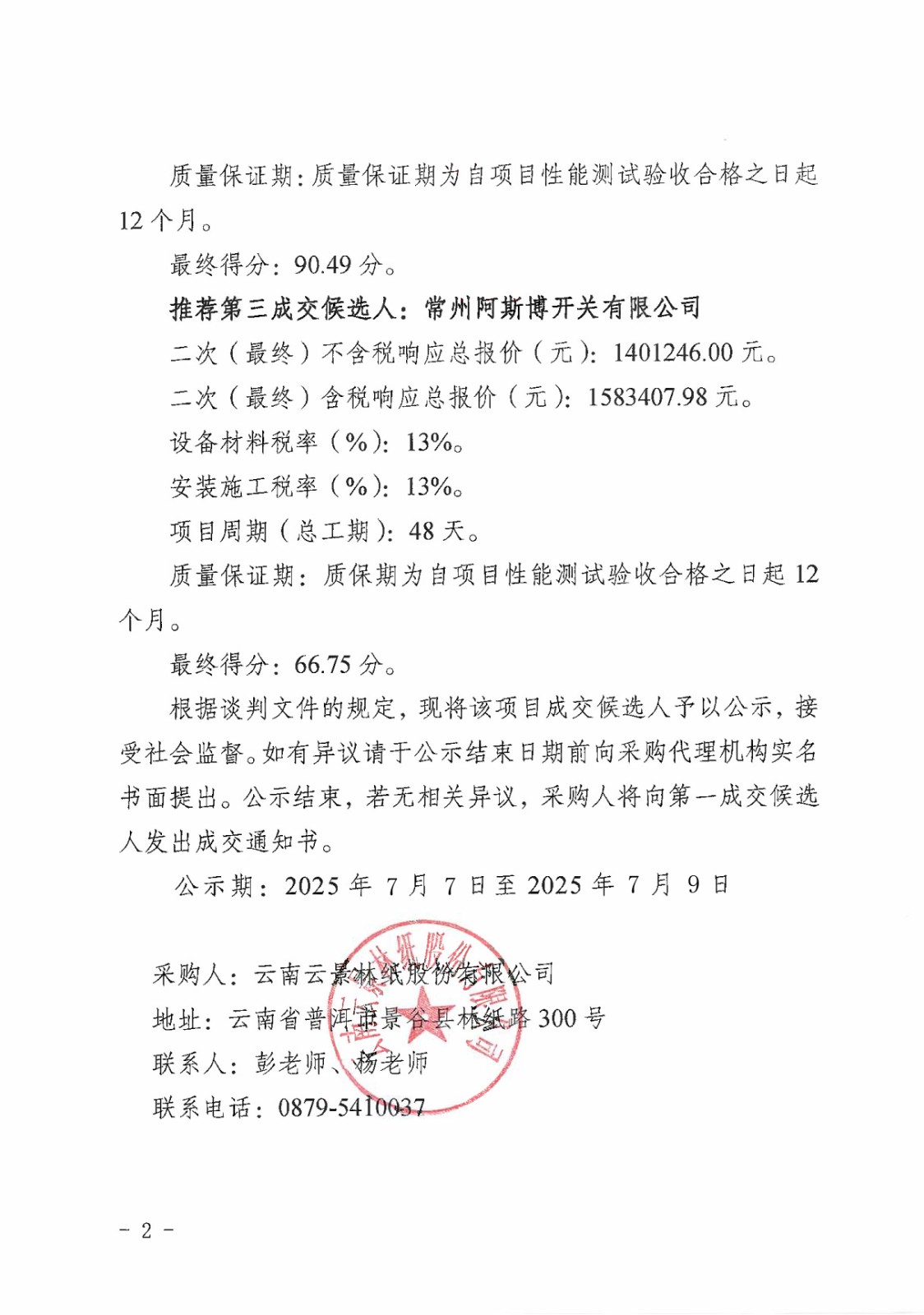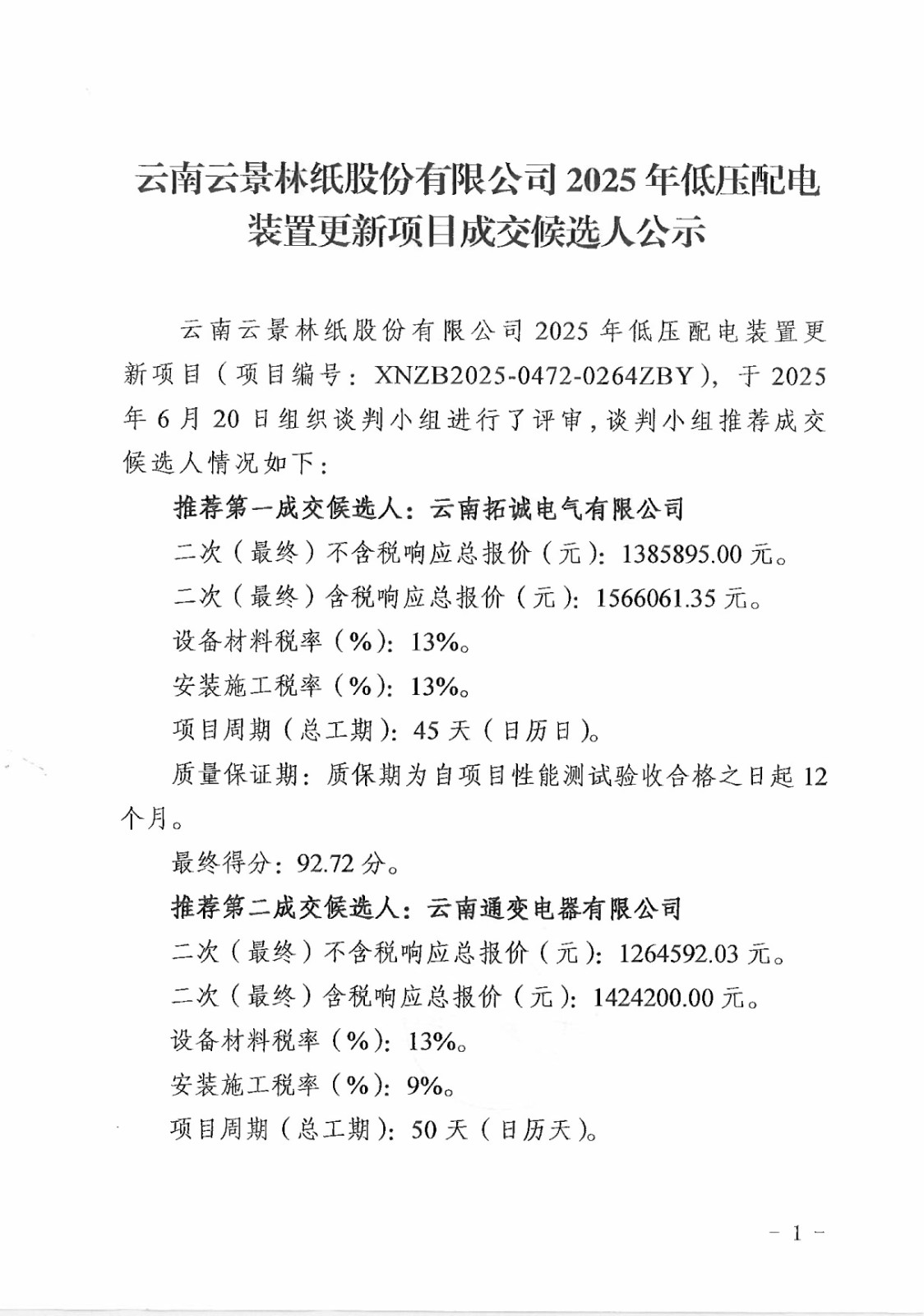 云南云景林紙股份有限公司2025年低壓配電裝置更新項(xiàng)目成交候選人公示