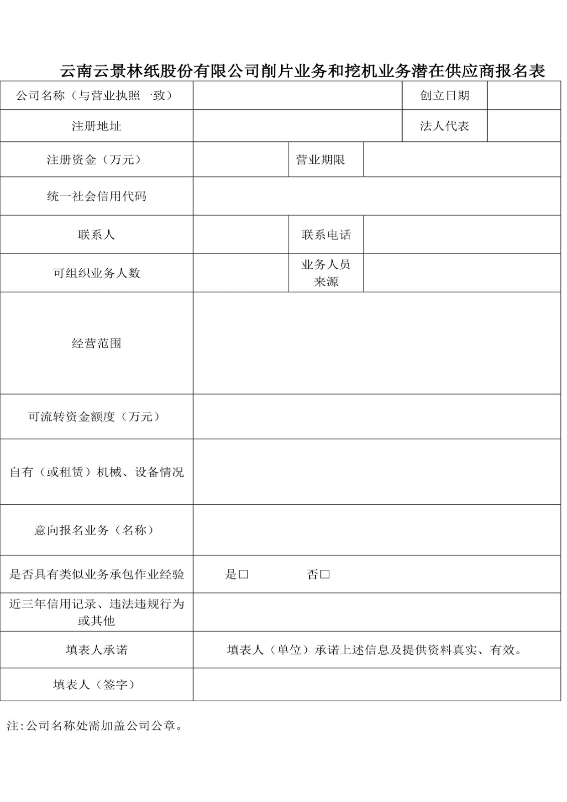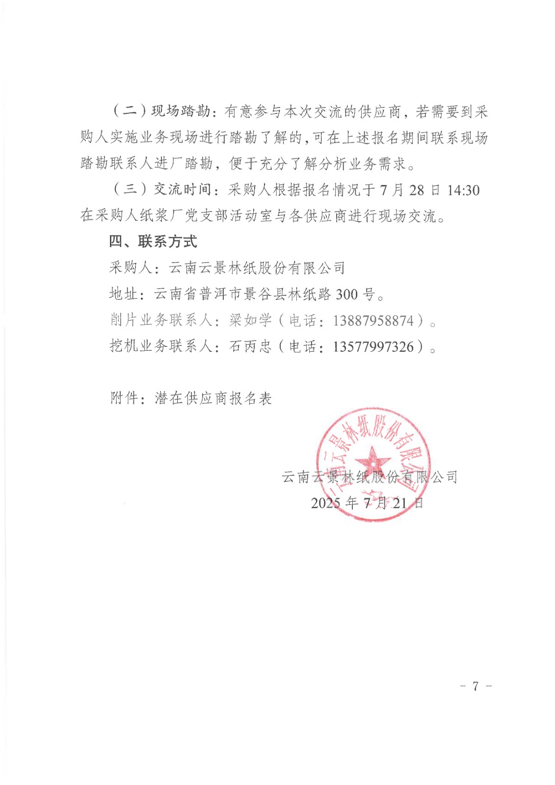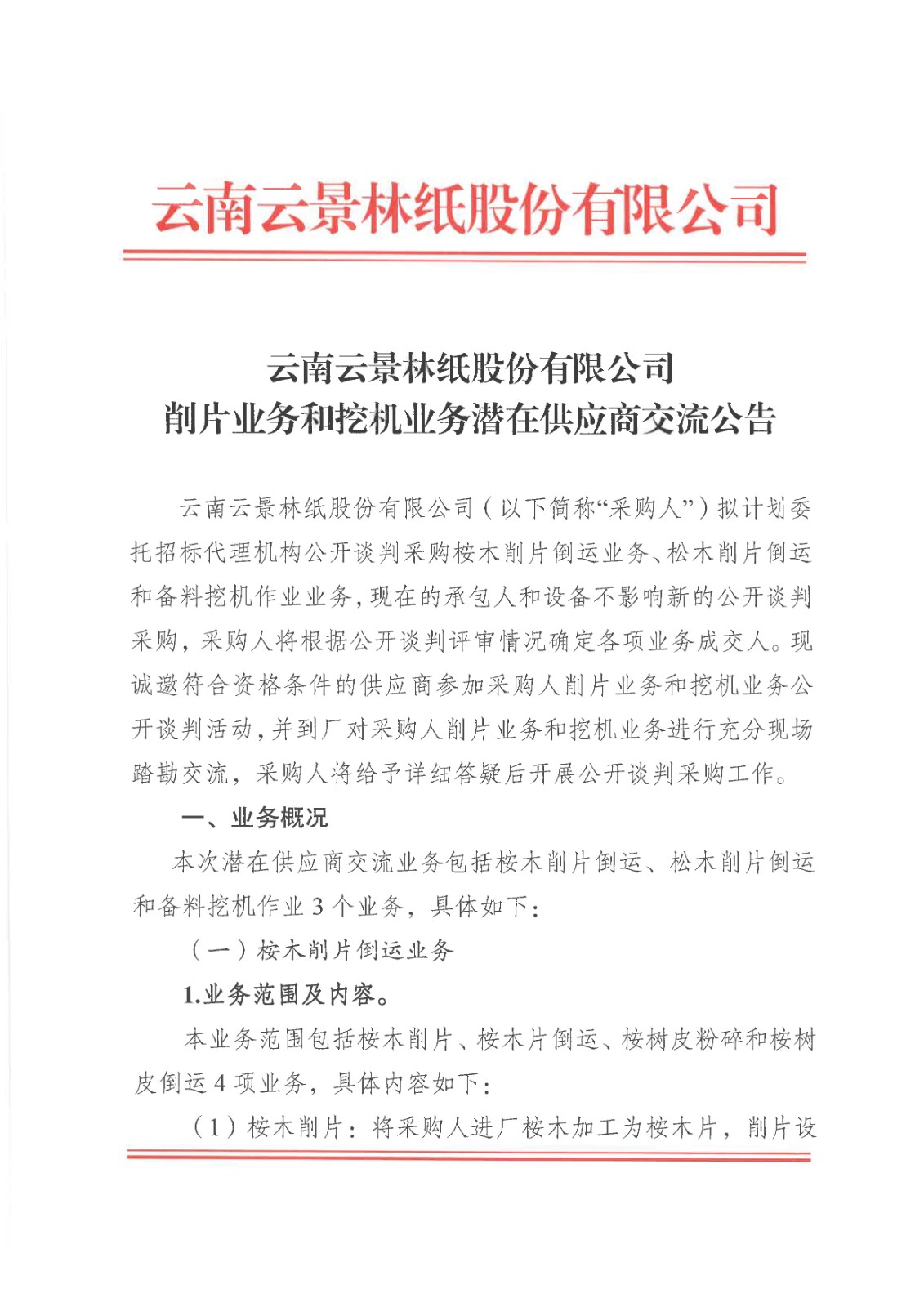 云南云景林紙股份有限公司削片業(yè)務(wù)和挖機業(yè)務(wù)潛在供應(yīng)商交流公告