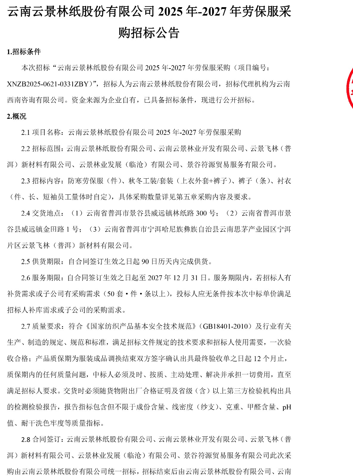 云南云景林紙股份有限公司2025年-2027年勞保服采購(gòu)招標(biāo)公告