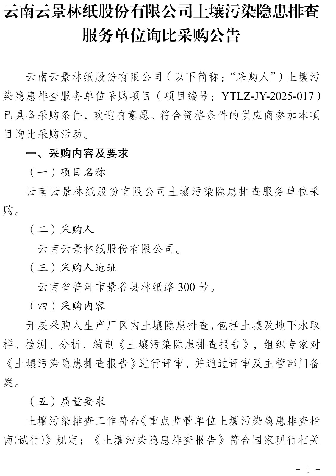 云南云景林紙股份有限公司土壤污染隱患排查服務(wù)單位詢比采購公告