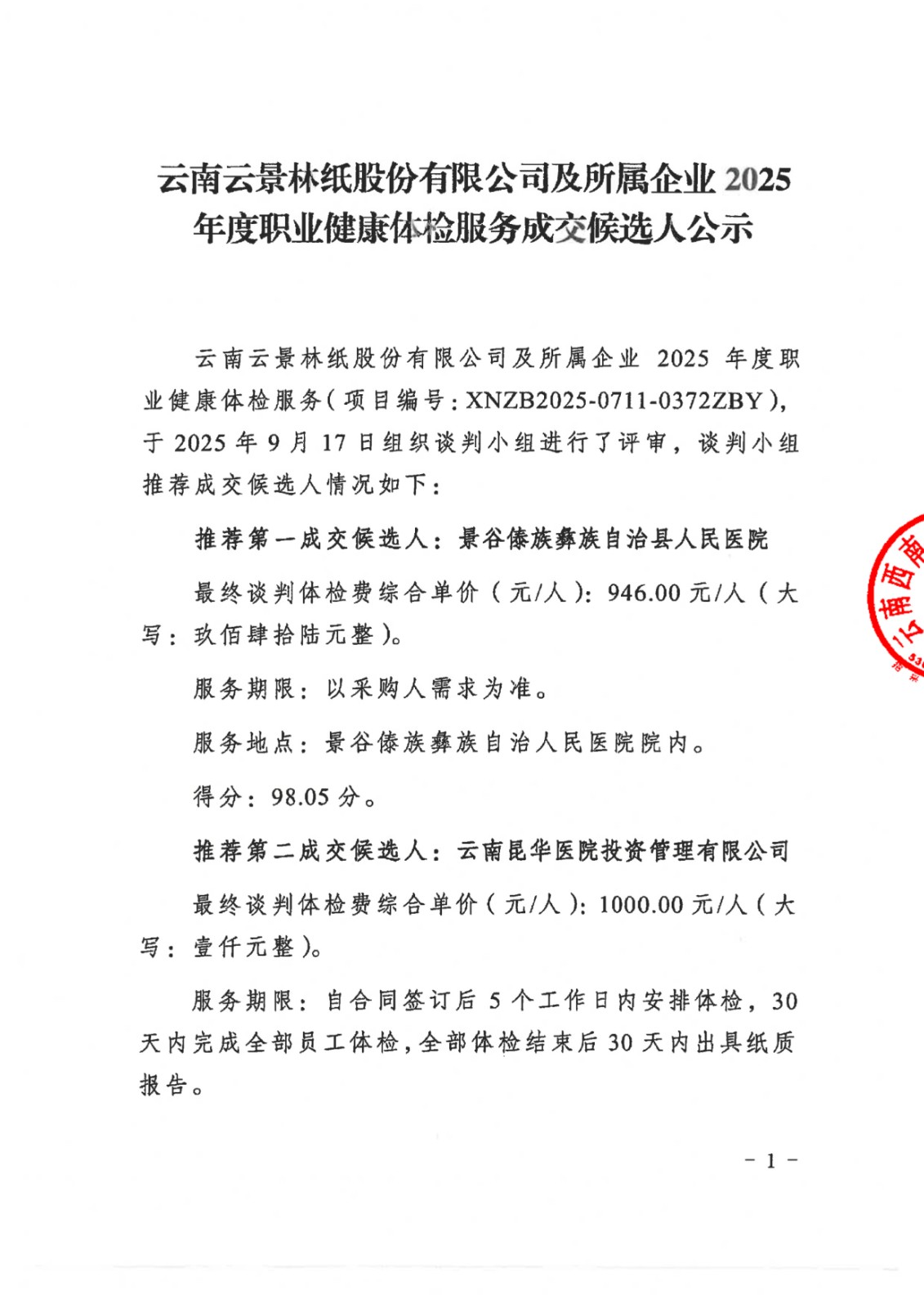 云南云景林紙股份有限公司及所屬企業(yè)2025年度職業(yè)健康體檢服務(wù)成交候選人公示