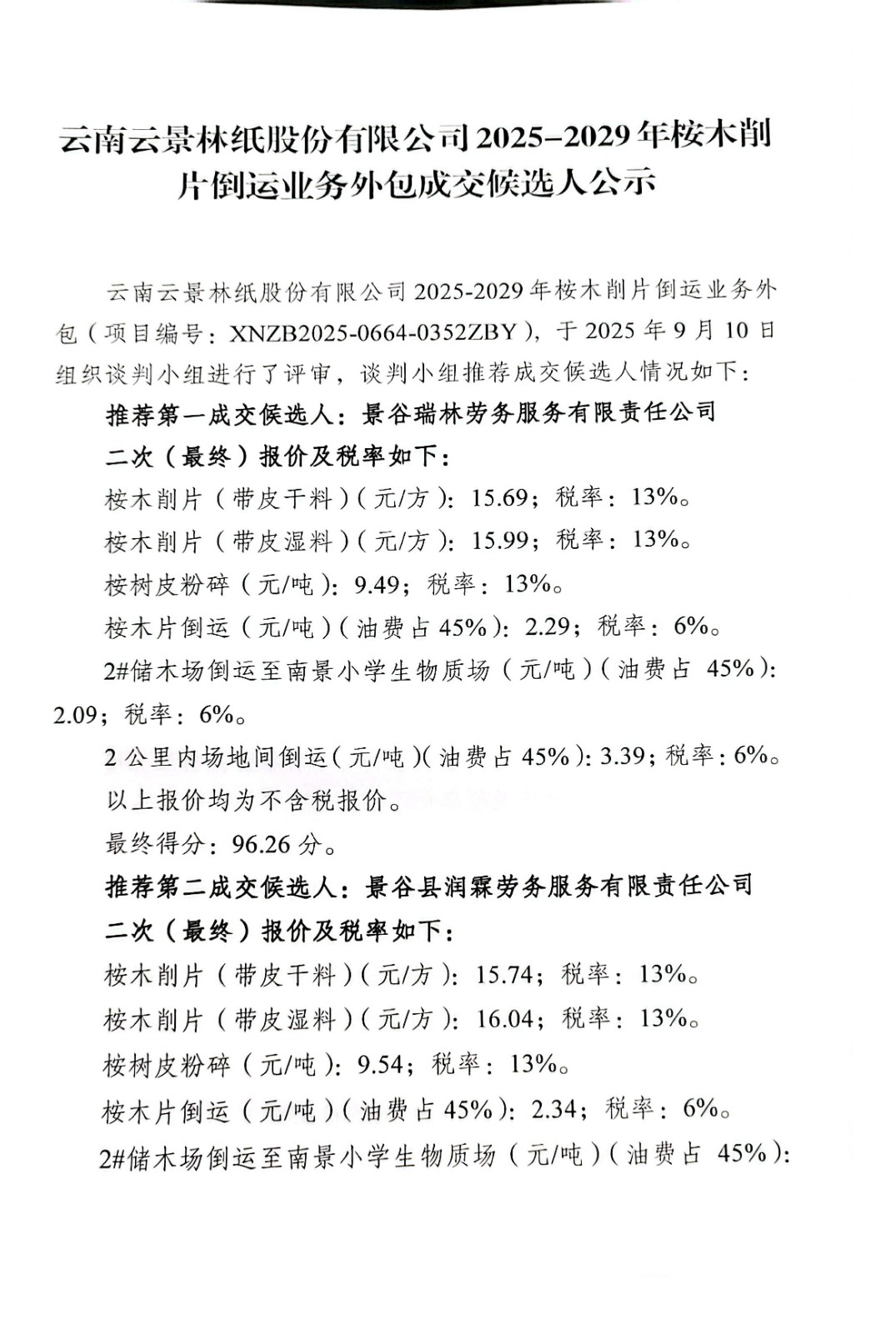 云南云景林紙股份有限公司2025-2029年木削片倒運(yùn)業(yè)務(wù)外包成交候選人公示