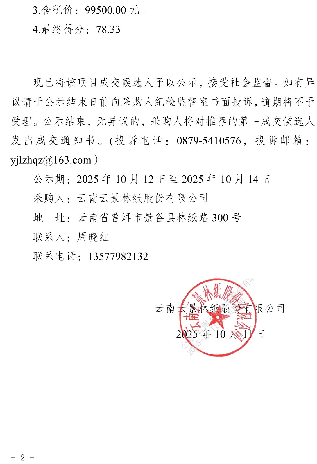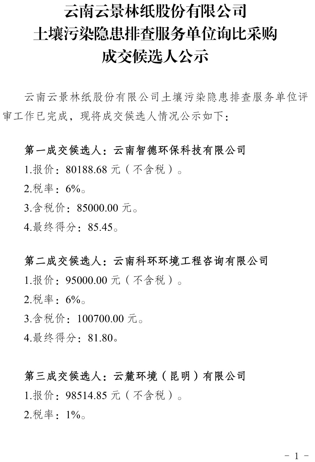 云南云景林紙股份有限公司土壤污染隱患排查服務(wù)單位詢比采購成交候選人公示