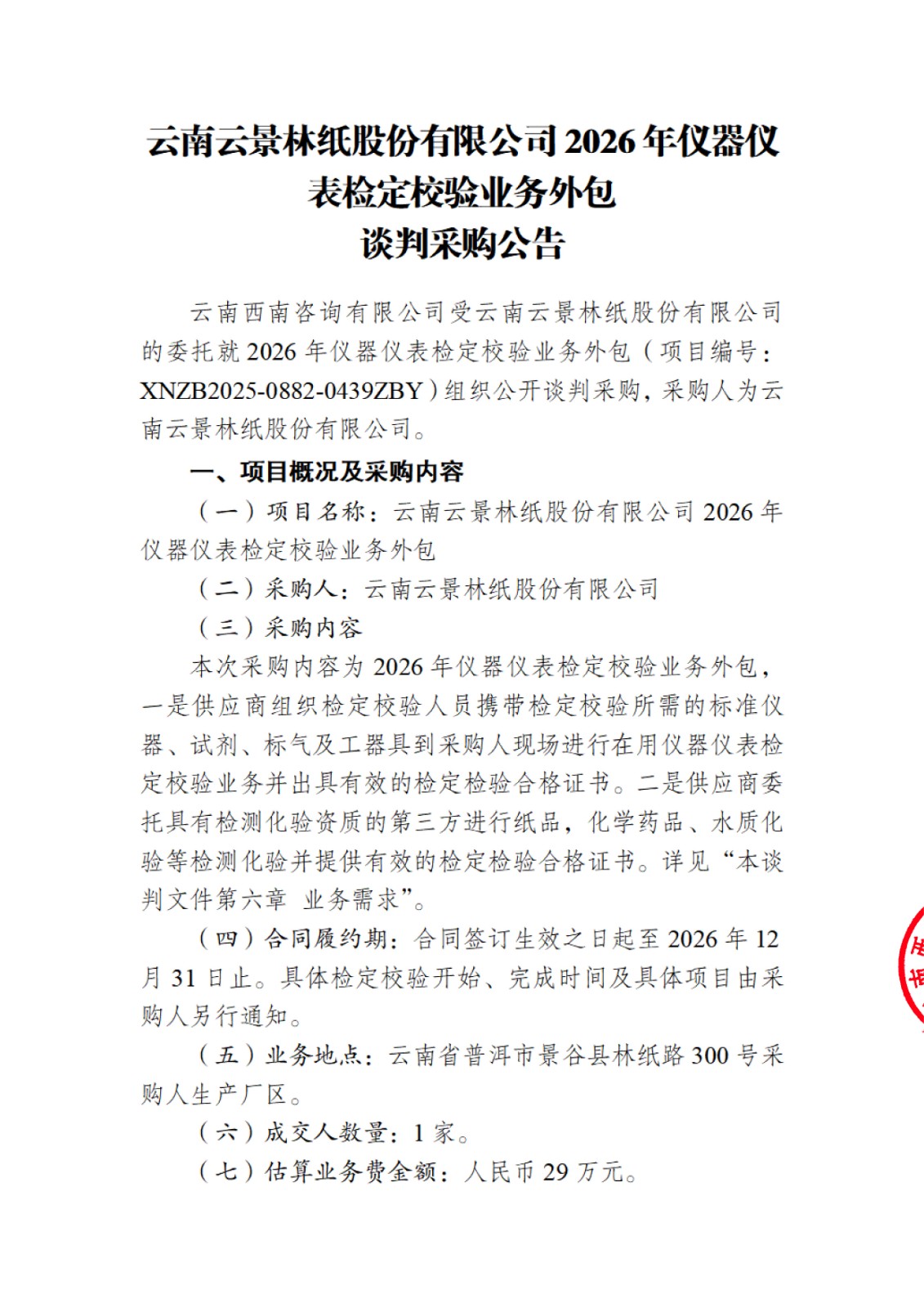 云南云景林紙股份有限公司2026年儀器儀表檢定校驗業(yè)務(wù)外包談判采購公告