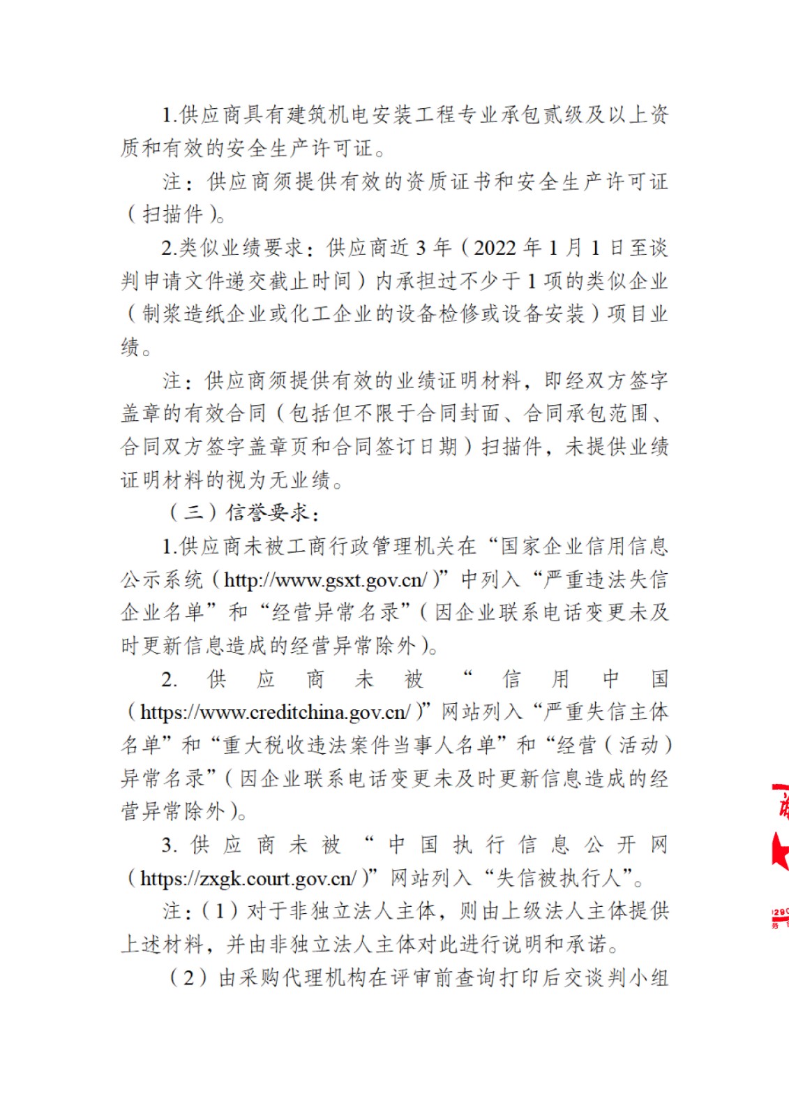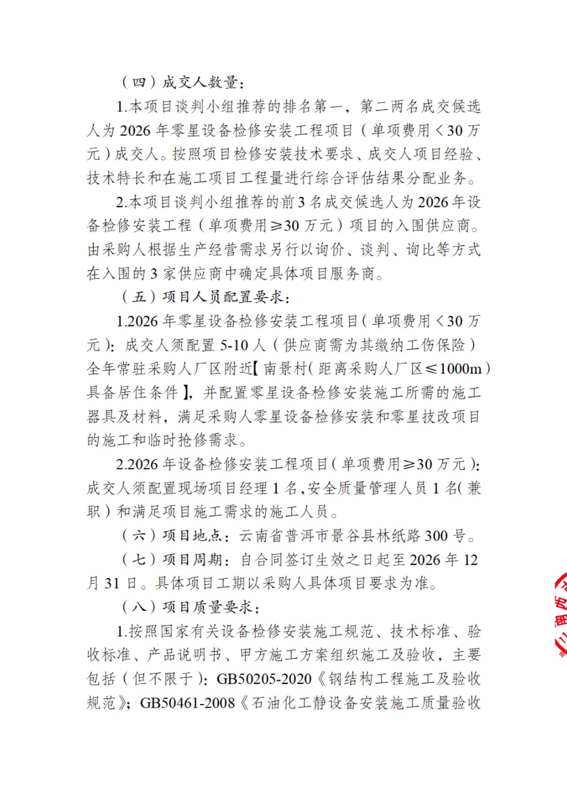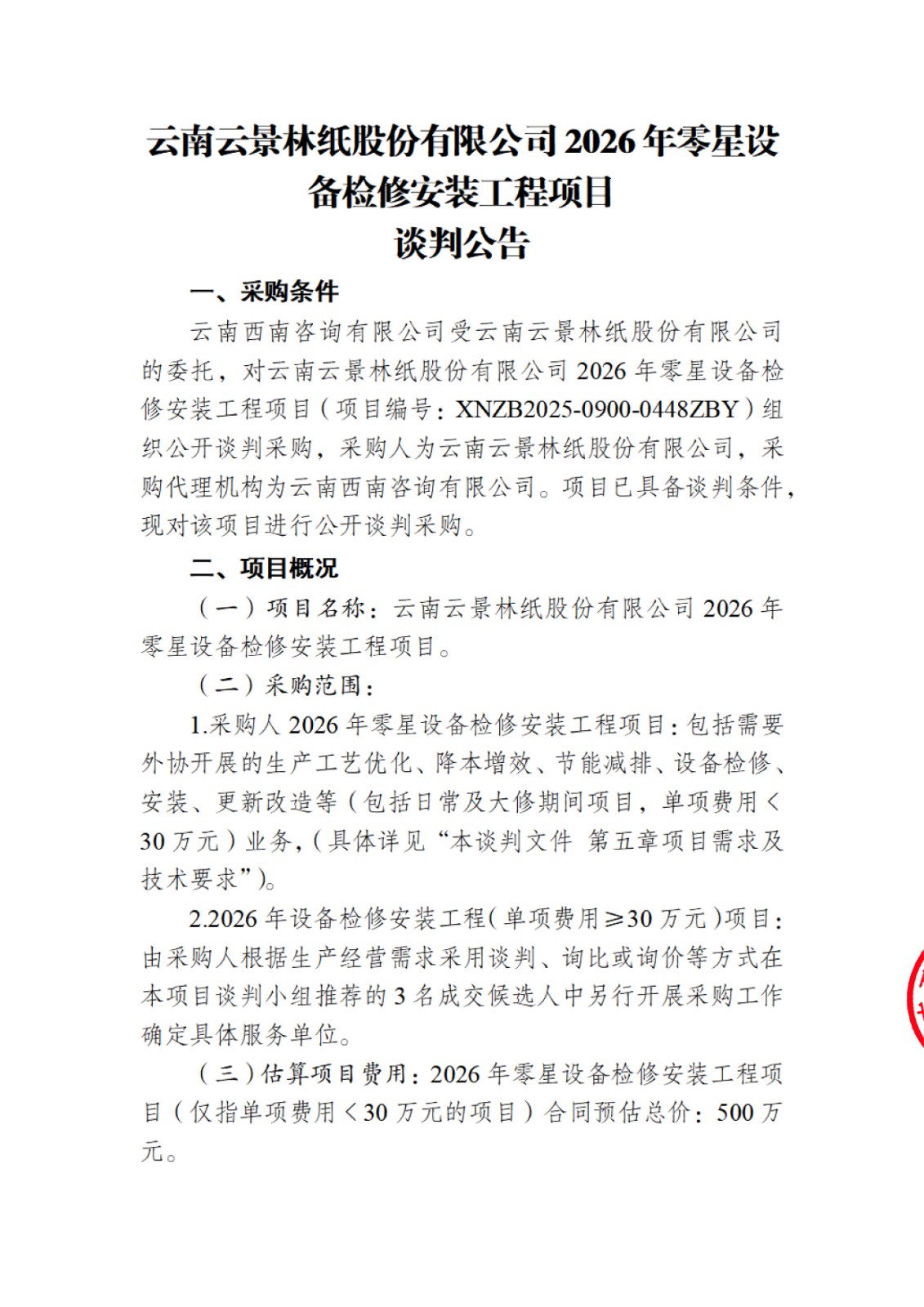 云南云景林紙股份有限公司2026年零星設(shè)備檢修安裝工程項(xiàng)目談判公告
