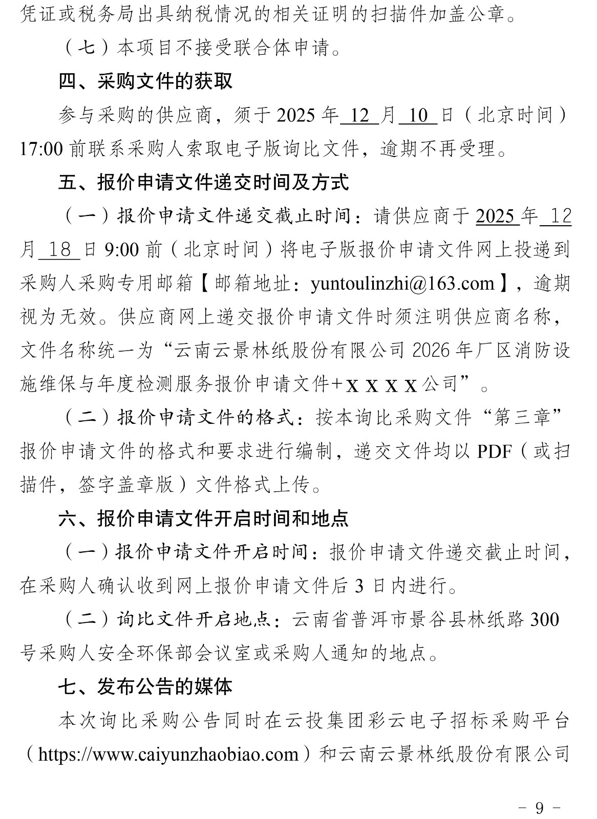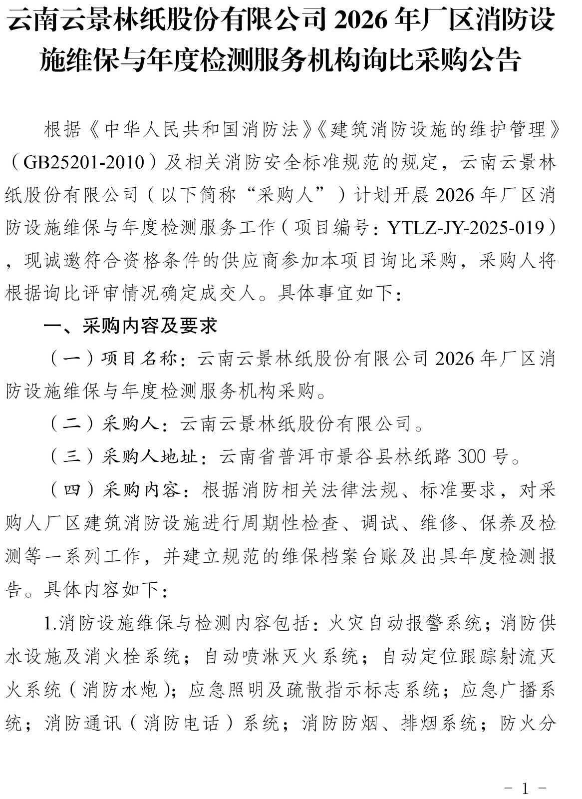 云南云景林紙股份有限公司2026年廠區(qū)消防設施維保與年度檢測服務機構詢比采購公告