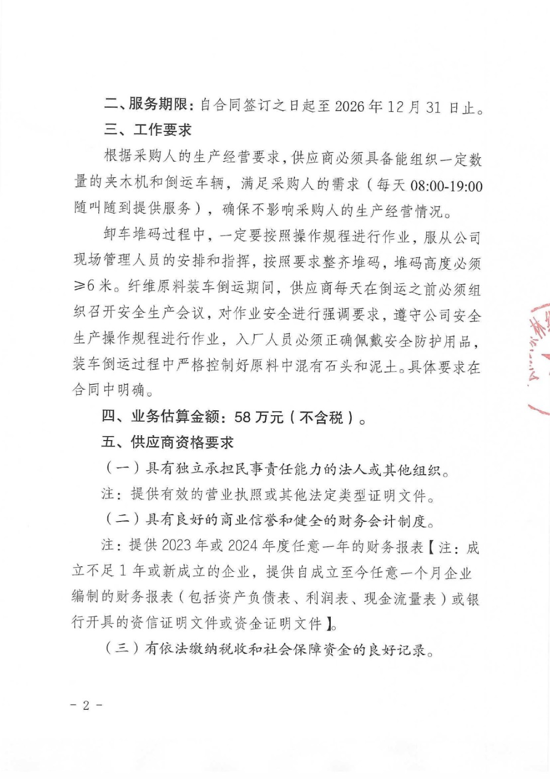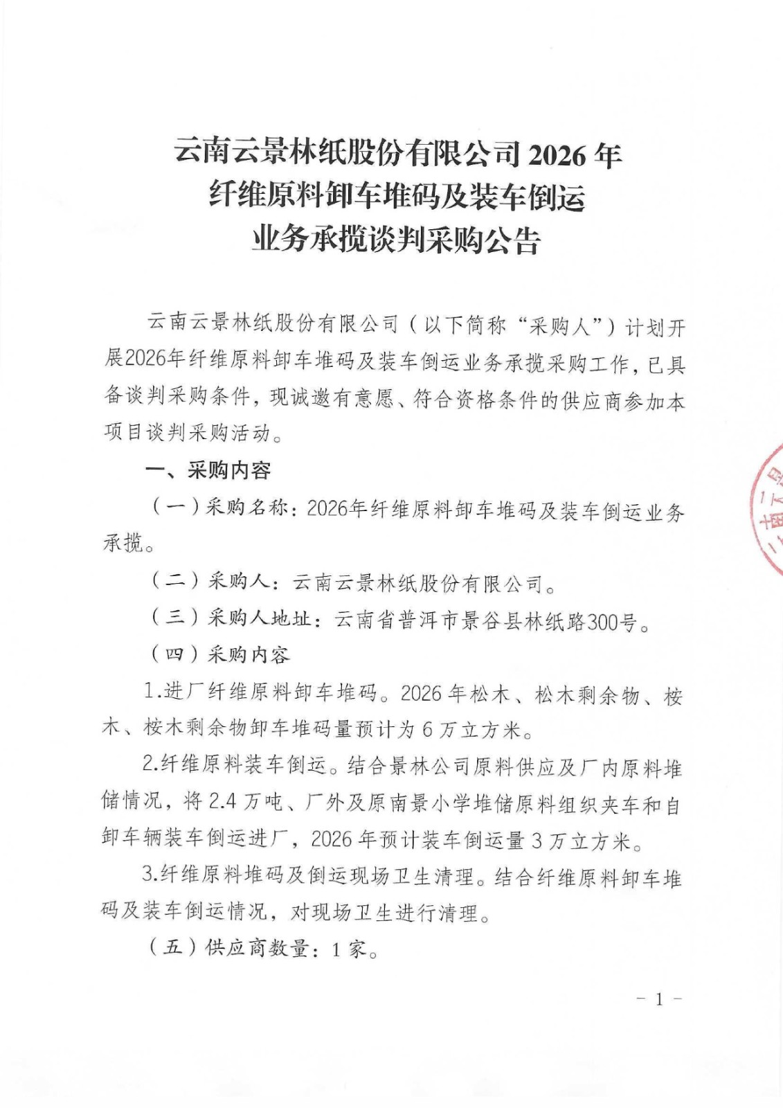 云南云景林紙股份有限公司2026年綜合物資裝卸搬運(yùn)業(yè)務(wù)承攬談判采購公告
