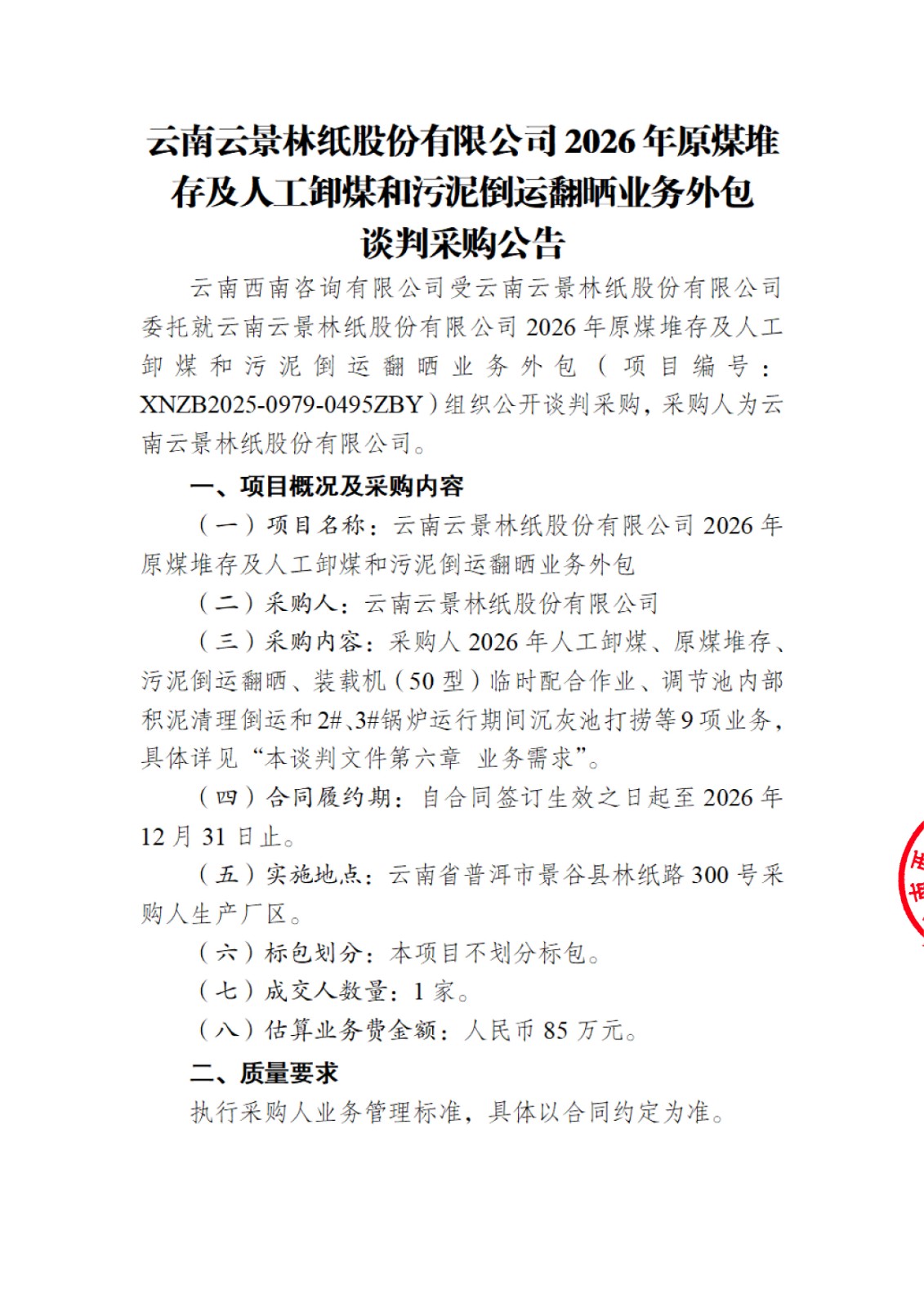 云南云景林紙股份有限公司2026年原煤堆存及人工卸煤和污泥倒運翻曬業(yè)務外包談判采購公告