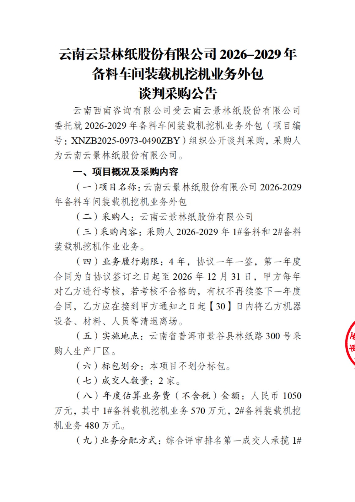 云南云景林紙股份有限公司2026-2029年備料車間裝載機挖機業(yè)務外包談判采購公告