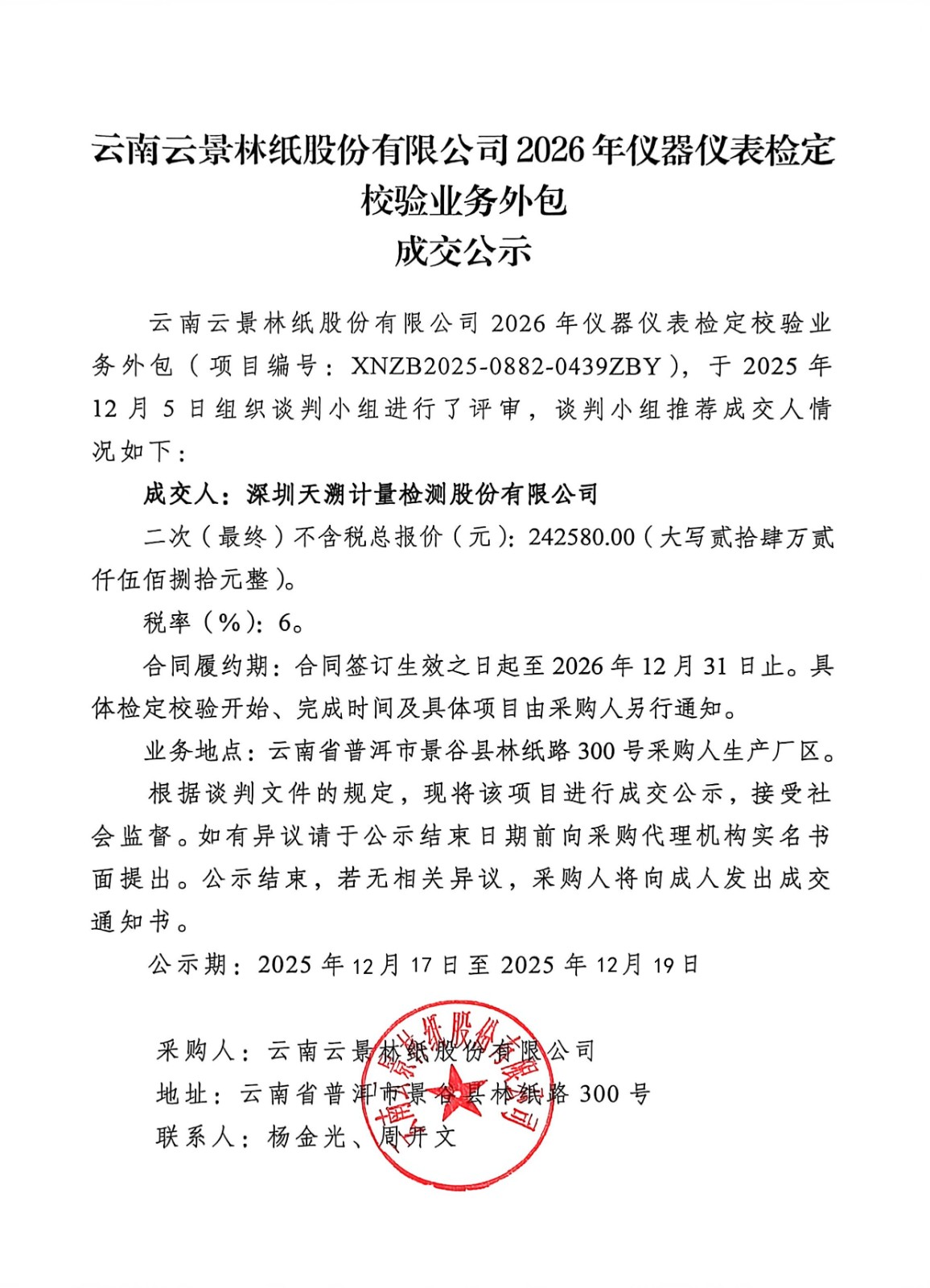 云南云景林紙股份有限公司2026年儀器儀表檢定校驗業(yè)務外包成交公示